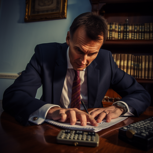 Jeremy hunt trying to use a calculator doing a tax return, in 11 Downing Street, but it's upside down and he looks very confused. Photorealistic.