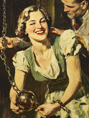 a vintage book cover smiling woman removing the shackles and ball and chain from his leg, mystery in the style by Dean Cornwell and gregory manchess n c wyeth, 1930's realistic, --ar 3:4 --style raw --v 6.1 --quality 2 --stylize 50