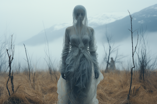 **very distant side view far away view of male black plastic mannequin, on a frozen snowy mountain with some grass emerging. on a cloudy day, and the mannequin facing three quarters sideways. Background of snowy mountain. Misty cold light. Autochrome --v 5.2 --s 1000 --ar 3:2