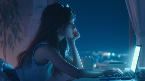 On a dark night, a laptop is placed on a beautifully lit desk, and a beautiful long-haired Korean woman, wearing a tank top and shorts, is sitting in front of the desk, looking at the laptop and thinking., cinematic lighting, ultra detailed, extreme wide shot, High Angle view, side view, --stylize 750 --style raw --ar 16:9 --niji 6