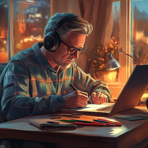 an early middle-aged man with short hair and glasses, writing in his notebook while wearing headphones and sitting at a desk. A laptop is on the table, and there is some clutter around him, such as pencils, pens, and colored pencils. The background has warm colors, and it appears to be dusk outside. The room feels cozy. Rendered in a cartoon style, using only vibrant pastel colors: light blue, sky-blue, purple, pink, orange, yellow, green, brown, and red. --s 250
