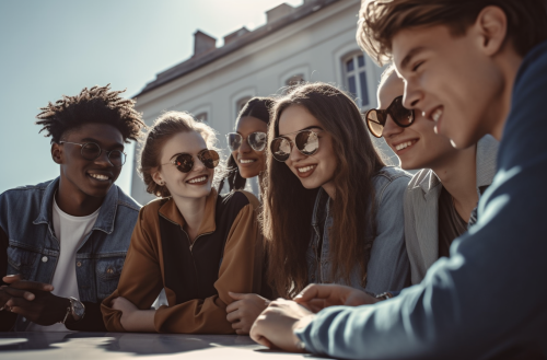 a close up shot of six young cool office workers dressed casually surrounding a sitting man at his table, laughing facing his laptop , against an undefined blue sky, bright light , bluish tones and sunlight,photorealistic, in the style of fujifilm pro 400h, viennese actionism, sony fe 85mm f/1.4 gm, Unreal Engine 5, Cinematic, Color Grading, Photography, Photoshoot, Shutter Speed 1/1000, F/22, White Balance, 32k, Super-Resolution, Megapixel, ProPhoto RGB, VR, Large, Epic, Artgerm, Half Backlight, Backlight, Daylight, incredibly detailed and complex, hypermaximalistic, elegant, hyper realistic, super detailed, c 15 --s 500 --ar 80:53 --v 5.0