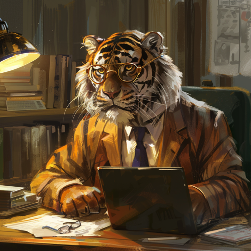 I'm looking for a scene of a bespectacled tiger working at a desk with a laptop