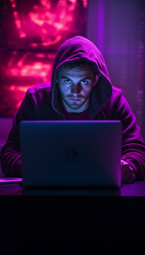 business stock photo of a man sitting in front of the laptop, cyber security, cyber, illumination, 8k, correct details, photorealistic, photography, --ar 3:2 --v