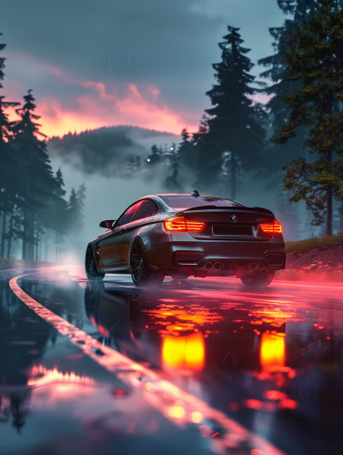A dark-themed wallpaper featuring a BMW M4 driving on an empty, rain-soaked road at night. The car is captured from a low angle, with reflections of the wet road adding a dynamic feel. The car’s headlights create a dramatic contrast against the pitch-black surroundings, highlighting the car’s powerful and elegant design --ar 9:16 --v 6.0 --s 750 --style raw