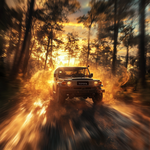 an illustration of a view of the horizon of a road from a black bmw convertible, the sun is shining in front, full of light illuminating the sky, some palm trees around the road adobe illustrator style --s 750 --niji 6 --style raw