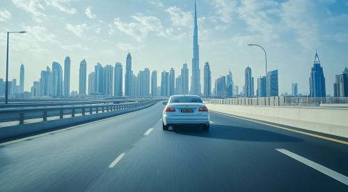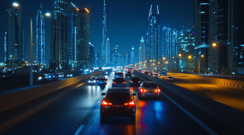 highway facade side camera, front facade, car perspective level. camera angle, front facade, on sheikh zayed road dubai, camera as a car driving on the highway, a spiritual style, in the style of blue light, cinema shots, Hollywood shots, cinematic scenes, fast and furious Style, Dubai Identity, abstract style, rustic scenes, Nikon d850, 32k UHD, strong use of negative space, matte photo, god rays --ar 128:71
