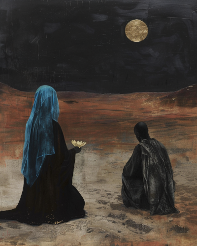 A woman in a black robe and blue head covering holding a gold lotus on the left, a kneeling black man wearing a gown made of cloth sitting next to him on the right side, an empty desert background, a dark night sky, a mysterious atmosphere, in the style of Tatsuo Miyajima, surrealism. --ar 51:64 --v 6.0