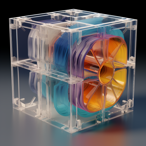 3d model of cooling cube. with a cross section showing condensentaion cooling the air as it flows through plastic cube