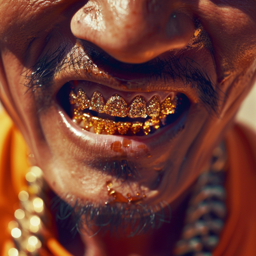 extreme close up photograph, a man’s mouth with sparkling orange gold teeth, grillz, starburst filter, fashion photography, Tibetan monk, editorial photo, street fashion magazine, Kodak
