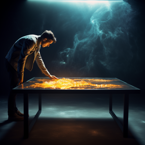 a man inspecting the surface of a table inside a bright::10 room. soft lighting from the window lights the mans face. his face is very close to the table and we see him with one eye closed looking at the shiny surface of the table. photo, realisitc. shallow depth of field. sony a7 with 50mm 1.8 aperture lens. 4k. natural light.