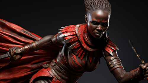 Dahomey Amazon female warrior fighting with a spear dark background with red mist in the air hyper realistic high detail --ar 16:9 --c 20