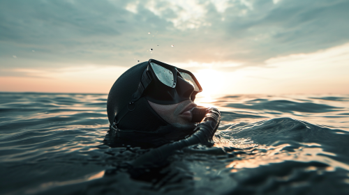 A fashion photo portrait of a free - diver coming out of the water and sing, greedily inhaling with open mouth on the surface of the water, bright day, free - diving mask, overcast low sky, sun set, --ar 16:9 --v 6.0 --style raw --s 50