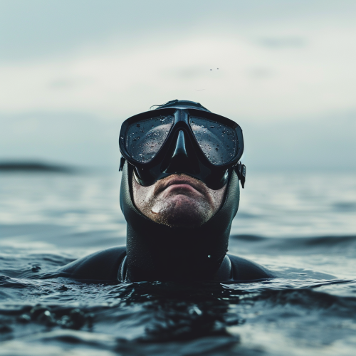 A fashion photo portrait of a free - diver coming out of the water and taking his first breath, greedily inhaling with open mouth on the surface of the water, bright day, free - diving mask, overcast low sky, cloudy day --v 6.0 --style raw --s 50