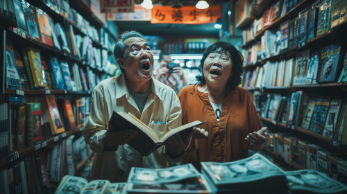 a commercial photo of a 45 years old hong kong zombie couple yelling to each others at a dramatic lighting book store, money notes everywhere, cinematic photography, --ar 16:9 --v 6.0