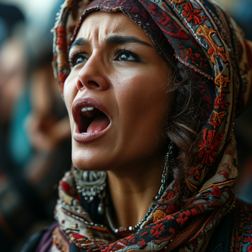 A biblical Arab queen shouts with her tongue out of her mouth at a conference in a grotesque and exaggerated manner, her expression transforming into a satirical caricature reminiscent of a political cartoon, with her mouth open, screaming and eyes bulging, embodying the essence of satire --v 6.0 --s 750