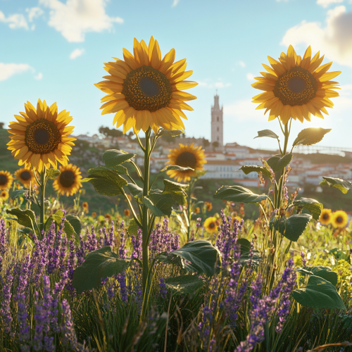 Hyper-realistic, cinematic-quality image of tall sunflowers under a vibrant clear blue sky during golden hour. The sunlight casts soft, realistic shadows, and the scene includes iconic Lisbon landmarks like the Belém Tower and Vasco da Gama Bridge, subtly blended into the natural environment. Native Portuguese flora, such as lavender and cistus flowers, surround the sunflowers with detailed textures and depth. The scene is focused on natural color grading and realistic lighting, with a shallow depth of field for a cinematic effect, indistinguishable from a photograph. No stylized, cartoonish, or painterly elements, only photorealism with rich, lifelike details - 16 by 9 aspect ratio –ar 16:9 –v 6
