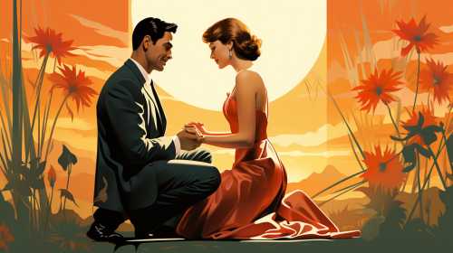 A man kneeling on one knee and looking up at a woman while holding out a bouquet of flowers to her with both hands, A woman smiling and looking down at a man, illustration, full body, high-quality, high resolution, caninecore, art deco sensibilities, serene and peaceful ambiance, 32k, Hyperrealistic, Photorealistic, very detailed, stunning, cinematic lighting, photograph, atmospheric, high detail, intricate detail, Photorealistic, ultra detailed, dynamic lighting, Sharp focus, no blur, dramatic lighting, ultra realistic, gothic, triptych, dystopia, intricate, beautiful, dramatic, epic atmosphere, --no people --ar 16:9 --s 750