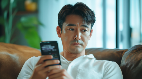 Create an image of a Korean male in his 40s sitting in a comfortable setting, such as a cozy living room or a modern office, intently watching a live commerce broadcast on his smartphone. The broadcast should be promoting discount vouchers for a golf course. The man should be depicted holding his smartphone close, with a look of concentration or interest on his face as he considers the offer. The smartphone screen should display a vibrant live commerce interface, with a host presenting the discount vouchers and interactive elements like hearts and viewer comments floating on the screen. The overall scene should convey a sense of engagement and enthusiasm, highlighting the appeal of getting a great deal on golfing, super realistic, UHD, future, Cinematic, Photography, Ultra - Wide Angle, Depth of Field, hyper - detailed, insane details, intricate details, beautifully color graded, Unreal Engine 5, Cinematic, Photoshoot, Shot on 25mm lens, Depth of Field, DOF, Tilt Blur, Shutter Speed 1/ 1000, F/ 22, White Balance, 32k, Super - Resolution, Megapixel, Pro Photo RGB, VR, Good, Massive, Half rear Lighting, Backlight, Natural Lighting, Incandescent, Optical Fiber, Moody Lighting, Cinematic Lighting, Studio Lighting, Soft Lighting, Volumetric, Conte - Jour, Beautiful Lighting, Accent Lighting, Global Illumination, Screen Space Global Illumination, Ray Tracing Global Illumination, Optics, Scattering, Glowing, Shadows, Rough, Shimmering, Ray Tracing Reflections, Lumen Reflections, Screen Space Reflections, Diffraction Grading, Chromatic Aberration, GB Displacement, Scan Lines, Ray Traced, Ray Tracing Ambient Occlusion, Anti - Aliasing, FKAA, TXAA, RTX, SSAO, Shaders, OpenGL - Shaders, GLSL - Shaders, Post Processing, Post - Production, Cell Shading, Tone Mapping, CGI, VFX, [...]
