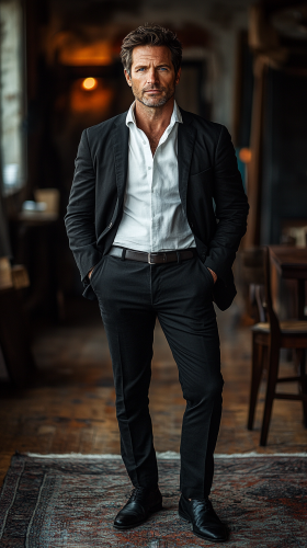 A strikingly handsome man with chiseled features, sitting confidently in a luxurious, ornately carved chair in a dimly lit room. He has a muscular, slender build, with short, dark hair styled slightly tousled. He’s wearing a sharp, black suit with a subtly open collar, showcasing a silver necklace with a large pendant. His expression is intense and serious, with piercing eyes that exude authority. His hand rests on his lap, wearing an elegant watch and a gold ring with a gemstone. The background hints at shadows and filtered light from a window, creating a moody, dramatic atmosphere. Cinematic lighting, realistic detail, dark color palette. –ar 3:4 –v 5 –q 2