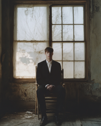 wolfgang tillmans photograph, man with short straight brown hair and short bangs, tall, wearing fitted black suite with white button up, sitting in wooden chair next to big window in an old, run down home, post punk aesthetic, --ar 4:5