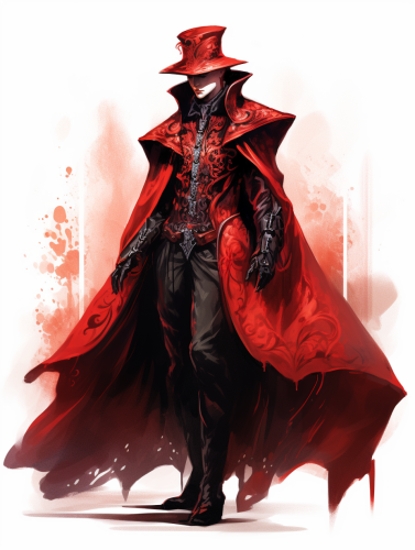 a man in an elegant yet simple black suit and a black leather glove on his right hand. His face is covered by a black ski mask. He is screaming. Dark background with neon red lighting