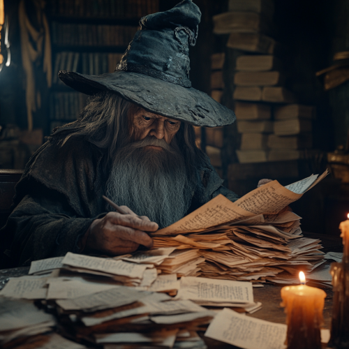 wizard sitting at a desk, dusty old room, piles of parchment paper sitting on the desk, stressed out looking through the papers, majestic brown hat and robe, long grey beard, lord of the rings, frank frazetta style, 4k, candle lit only light dark room, pen in hand with quil on table, papers are a mess fringed at the ends, piles of coins and other tools on the desk