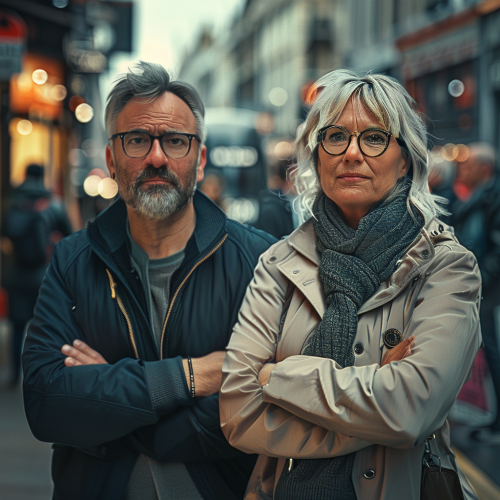 blonde middle-aged woman and dark-haired middle aged man with glasses stood in busy street in UK with arms crossed. Photo realistic