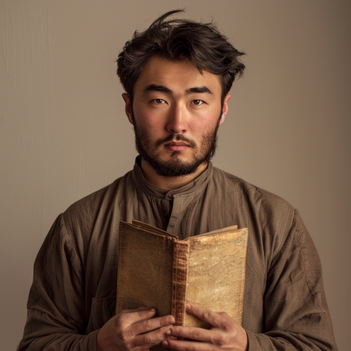 tinder profile of a handsome Buryat man with a book on a plain beige background