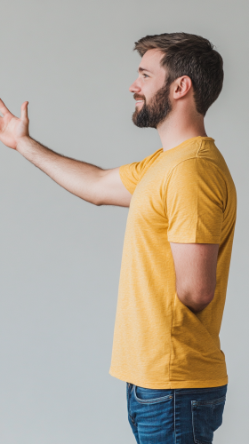 3/4 back view of an impresed happy man with a wow expression on his profile, with short hair and a short beard, wearing blue jeans and a yellow t-shirt, extended arm as if he is reaching out for something, and his hand's palm facing up, gray plain background, hyper-realistic photography --ar 9:16