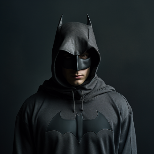 Fashion photography of a Man wears a dark gray hoodie which is made of thicker, slightly shimmery sweatshirt material. The hood is cut slightly larger and falls far over the head to create a mysterious silhouette. The sleeves are longer than usual and end in a slightly flared elastic cuff, reminiscent of Batman's cape