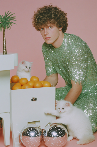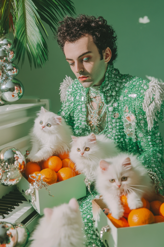 a photo in the style of Javiera Estrada, of a man in a beaded green dress, unpacking three boxes filled with oranges, white fluffy kittens at his feet are playing with shiny chrome balls, there is a white piano with a giant palm tree on it --chaos 11 --v 6.1 --p 924polm