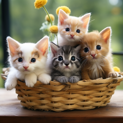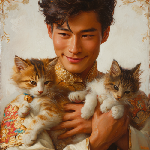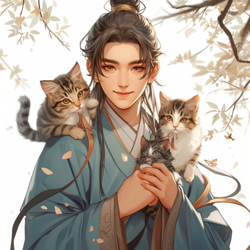 the cute 2d game A cartoon-style Chinese gentle man holding 2 kittens and a kitten on his shoulder, the young man is smiling faintly dress neatly , rich in detail, with a white background --s 250 --v 6.0