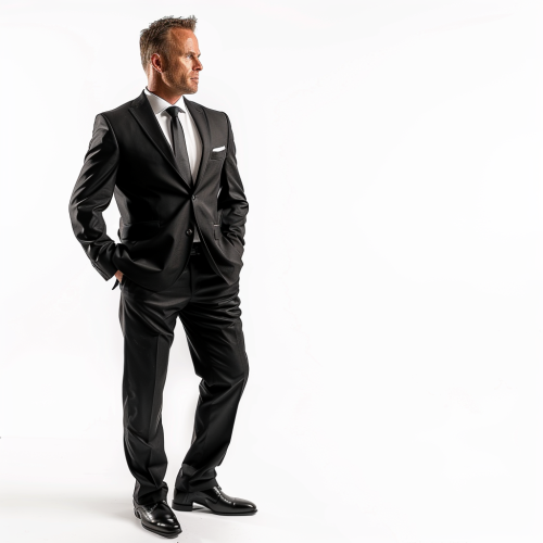 full length photo type studio of a Man in an elegant suit, Business , confident, studio style shot on white background