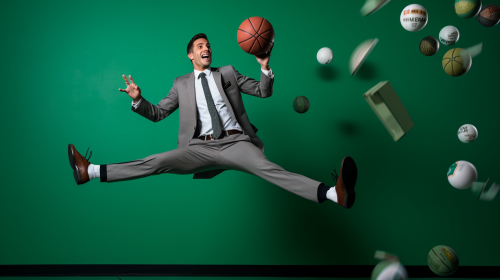 hyperreal photo, Latin man, happy, content, father, with a suit and tie, gray pants, black tennis shoes, green, gray, green colors, suspended in the air like a basketball player, with a ball made of papers, green background, basketball style, much light, --ar 16:9