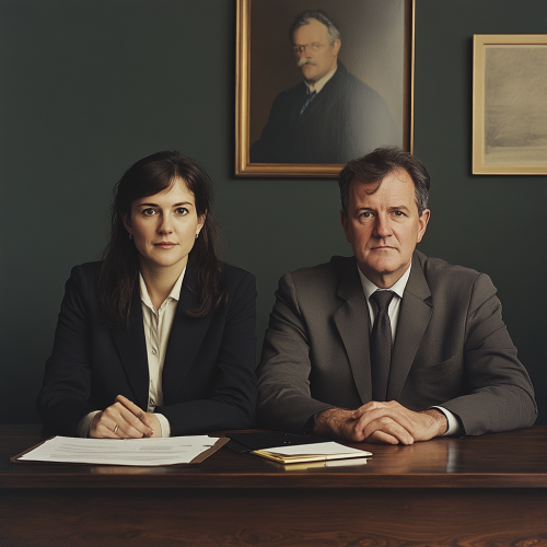 ultra realistic image of a woman in smart clothes sitting at a table beside a breaded man in his mid fifties. On the desk in front of them is paperwork in a folder. The two people are facing the camera and smiling. square aspect