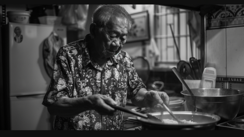 mid shot, dynamic angle, indoors, Malay man in late 40s, wearing malay outfit, scoops porridge with ladle in hand, HDB home, singapore --ar 16:9