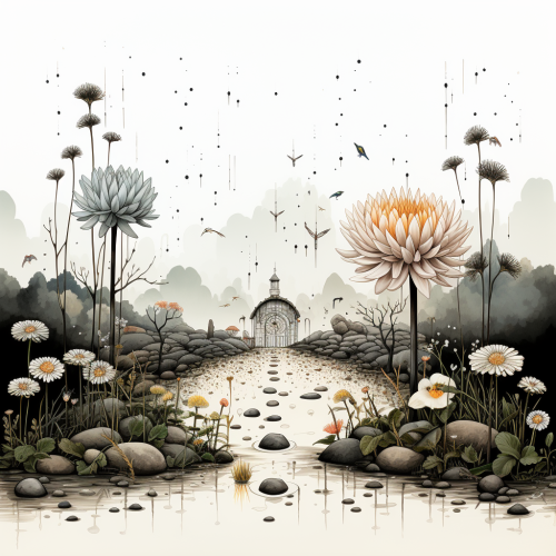 cute art in black and white style in the Korean style there is a bag of sand on the grass, it is raining and drops on the flowers, inside in the middle of the sand there is one small flower growing on which there are rain drops --s 750