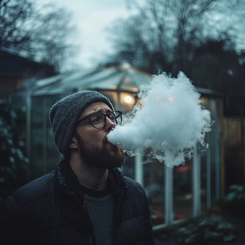 average looking man in his mid 30s with stubble and glasses wearing a beanie blowing a huge cloud out of his mouth in his small london suburb backyard with an old rundown glass shed behind him on a cold cloudy evening