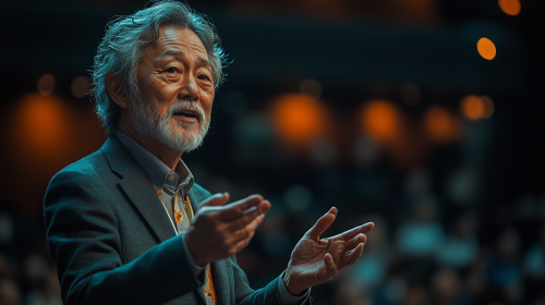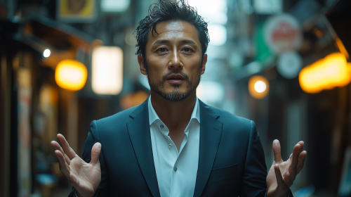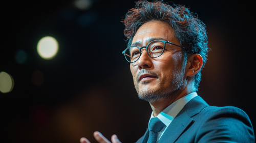An authoritative Japanese man in his 40s, wearing a suit and making hand gestures, is giving a presentation on stage. The stage is very dark. Oblique angle image. Photographic quality. --ar 16:9 --style raw --s 750