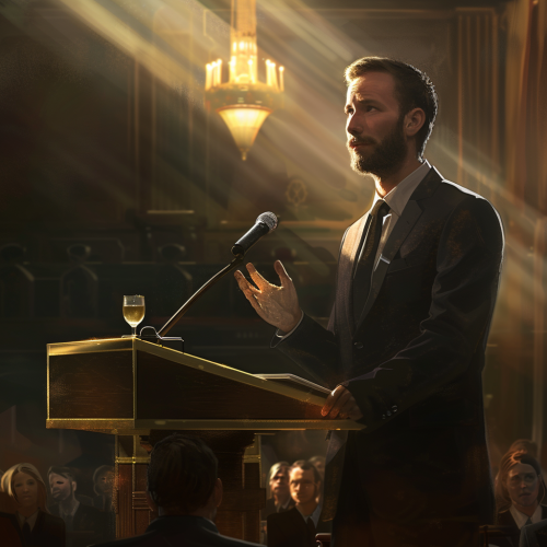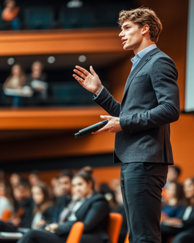 a 35-year-old man, brunette, wearing a suit, standing on a stage in front of a lecture hall, microphone in hand, speaking, close-up of upper body --no beard --ar 4:5