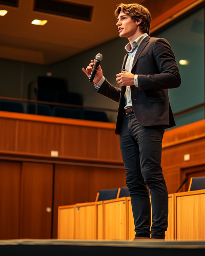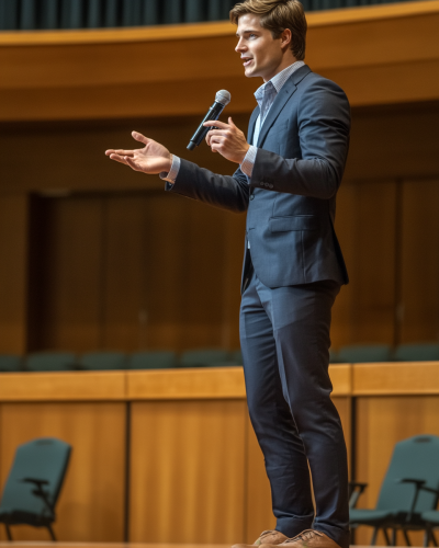 a 35-year-old man, brunette, wearing a suit, standing on a stage in front of a lecture hall, microphone in hand, speaking, close-up, upper body shot --no beard --ar 4:5