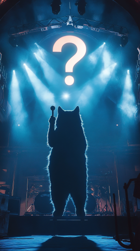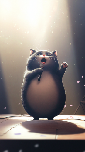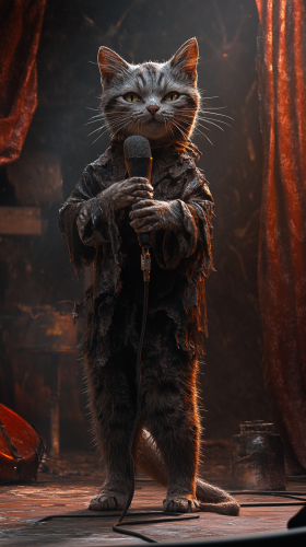 An ancient, frail cat standing on a dimly lit stage, holding a vintage microphone in its paws. The cat looks worn out, with ragged fur and torn clothes, conveying a sense of poverty. The atmosphere is fantastical, with a magical aura around the stage, but the cat's appearance contrasts with the fantasy, emphasizing its struggle. The stage is old and eerie, with faded curtains and a faint glow . 8k, high quality, --ar 9:16