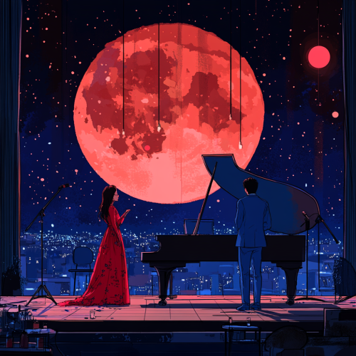 There is a stage with a lyrical cafe atmosphere. The background of the stage is the red moon and the blue star. There is a Korean woman in her 20s wearing a beautiful red jeogori on the stage. Next to it is a man in his 20s wearing a blue suit. They are lovers. Please draw it in an animation style