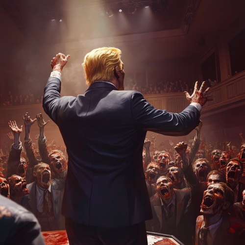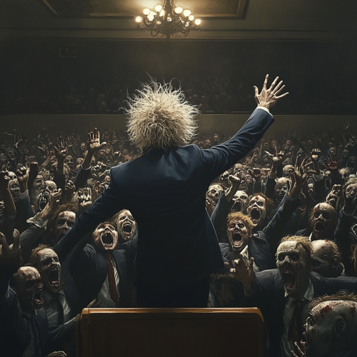 Photorealistic image of a Man with mussed up blonde and very slightly orange hair, wearing a dark blue suit on a stage with left arm and first raised, in a revolutionary way, in front of a podium, view from back, in a small venue speaking to a crowd of 10 excited zombies, spaced sparsly in an outside empty mid sized venue. The zombies are cheering and chanting, and some are falling apart