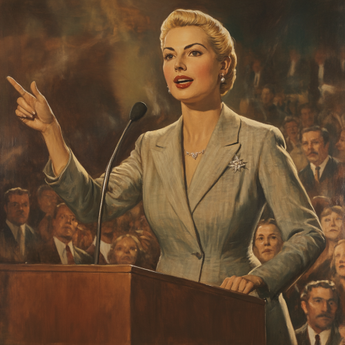 A Renaissance painting of an iconic Eva Duarte Peron wearing an elegant suit giving her speech at the podium in front of people, she is pointing to something on stage with one hand while speaking into a microphone held up by someone beside here. She has blonde hair pulled back tight behind her ears. In background we see blurred out-of-focus images of a few people