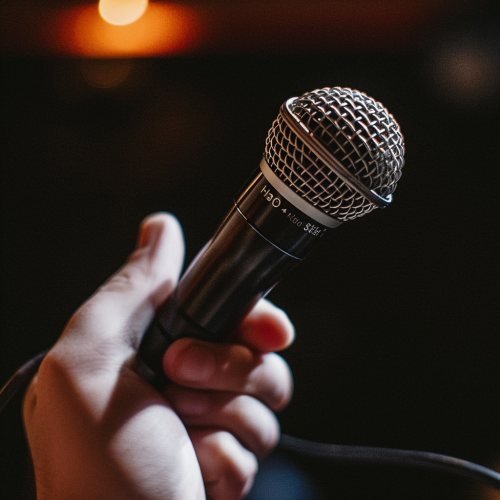a closeup photo of a hand holding a drooping microphone by the cable --v 6.0