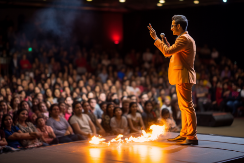 An authoritative Japanese man in his 30s, wearing a suit and making hand gestures, is giving a presentation on stage. The stage is very dark. Oblique angle image. Photographic quality. --ar 16:9 --style raw --s 750