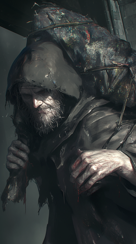 close up of a derelict looking man wearing a tattered coat and hood and carrying a large black gothic sack over his shoulder in a dark house + horror + art style of Capullo, Brom, Whelan, aly fell rutkowski, art germ, rossdraws, and franzzeta + art station + ultra detailed + hyper realistic + 8k --ar 9:16 --niji 6