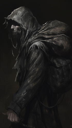 a derelict looking man wearing a tattered coat and hood and carrying a large black gothic sack over his shoulder in a dark city + horror + art style of Capullo, Brom, Whelan, aly fell rutkowski, art germ, rossdraws, and franzzeta + art station + ultra detailed + hyper realistic + 8k --ar 9:16 --niji 6